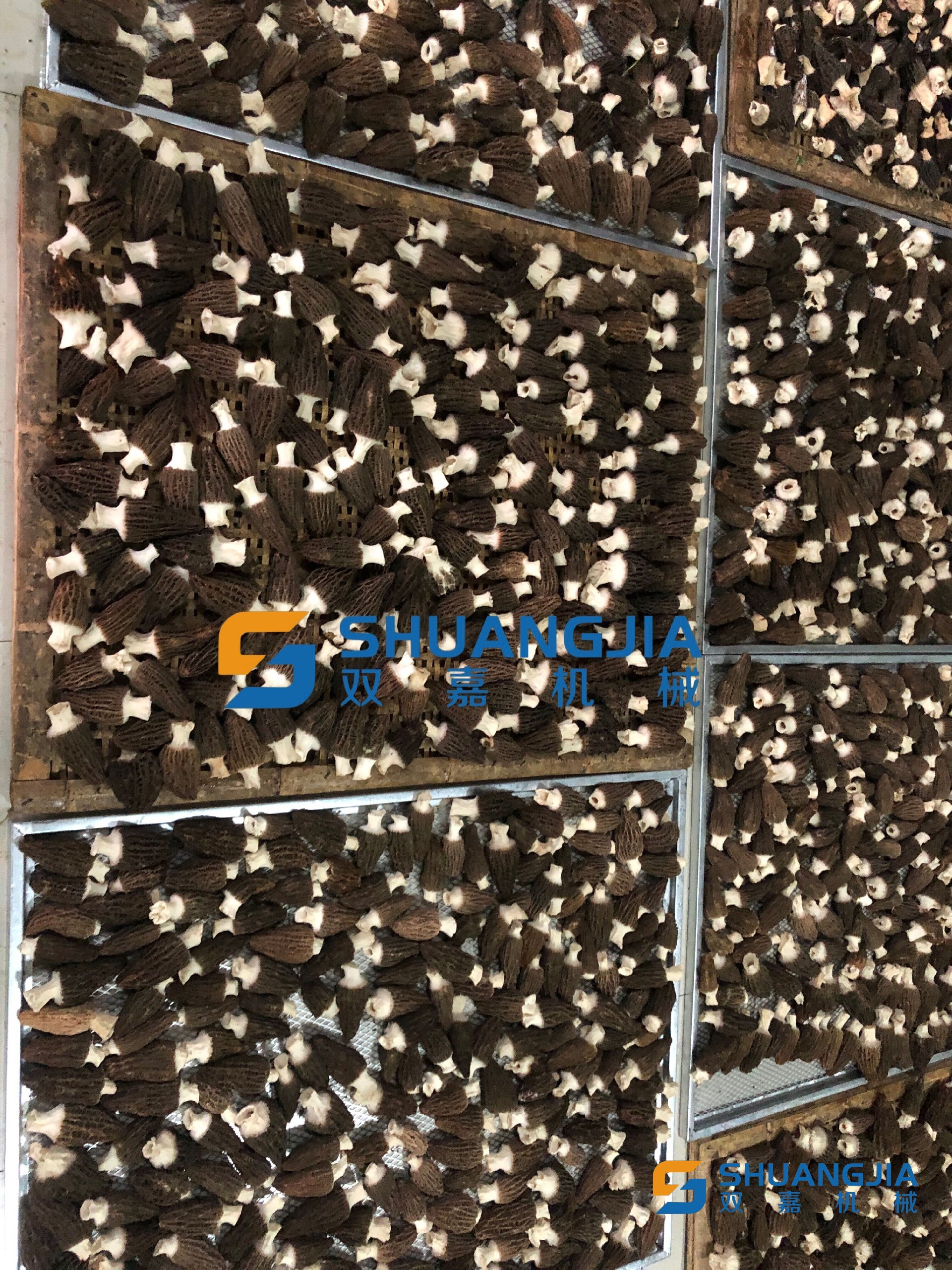 1、烘干初期:將新鮮的羊肚菌排放于烘篩上,推入烘干機起烘,溫度35℃,濕度70%以內(nèi),烘3小時左右。