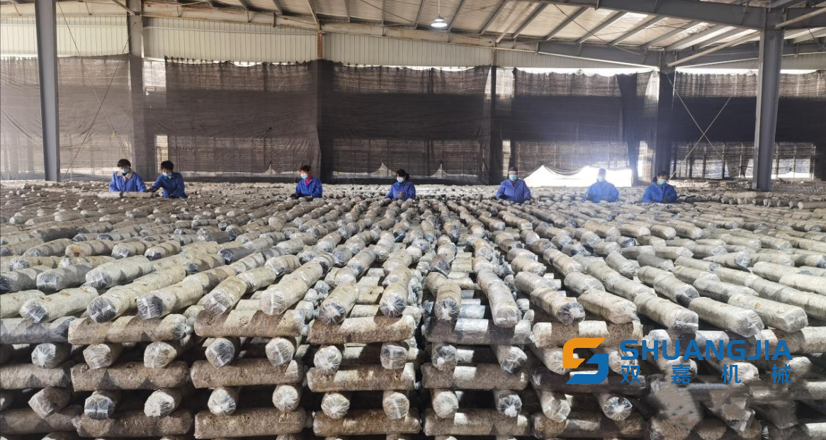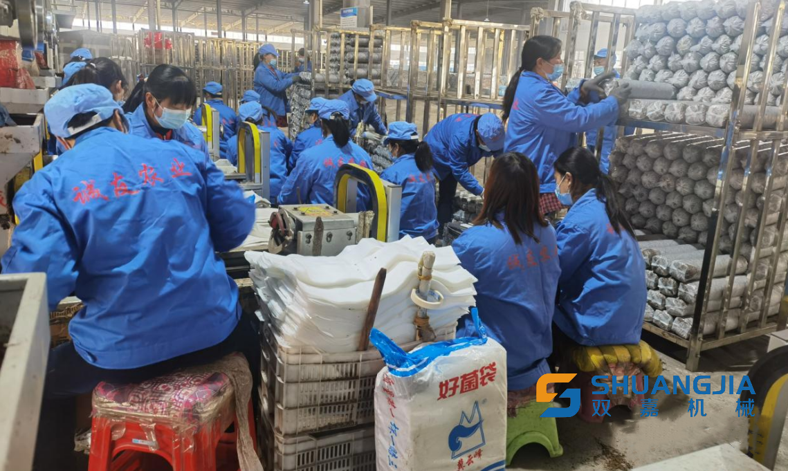 伴隨著機(jī)器的轟鳴聲,工人們正在裝袋、轉(zhuǎn)運(yùn)、滅菌、上架,整個車間一派繁忙景象。大棚內(nèi),成千上萬的菌棒猶如“甲士”一般整齊排列,場面壯觀,“躍躍欲試”的小香菇正在“探頭張望”。