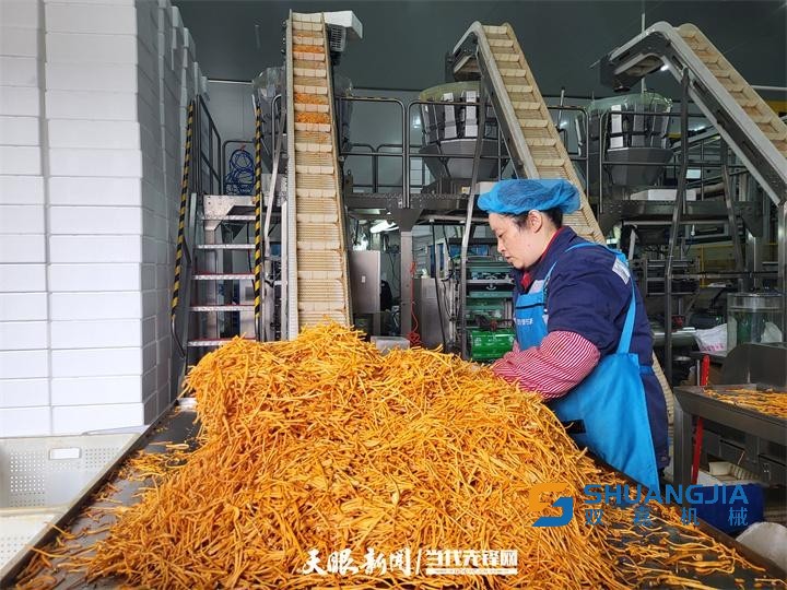 走進(jìn)工廠,只見數(shù)十臺自動化設(shè)備有序運(yùn)轉(zhuǎn),一袋袋包裝精美的蟲草花經(jīng)過裝盆、滅菌、接種、培養(yǎng)、出菇、包裝等工序后發(fā)往川渝、兩廣及海外市場。