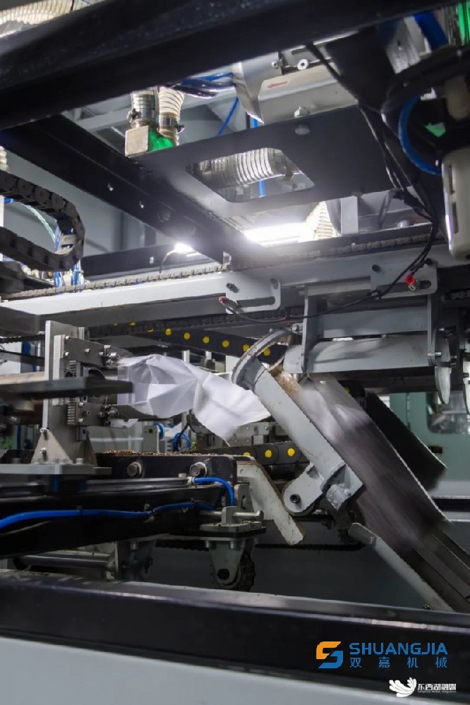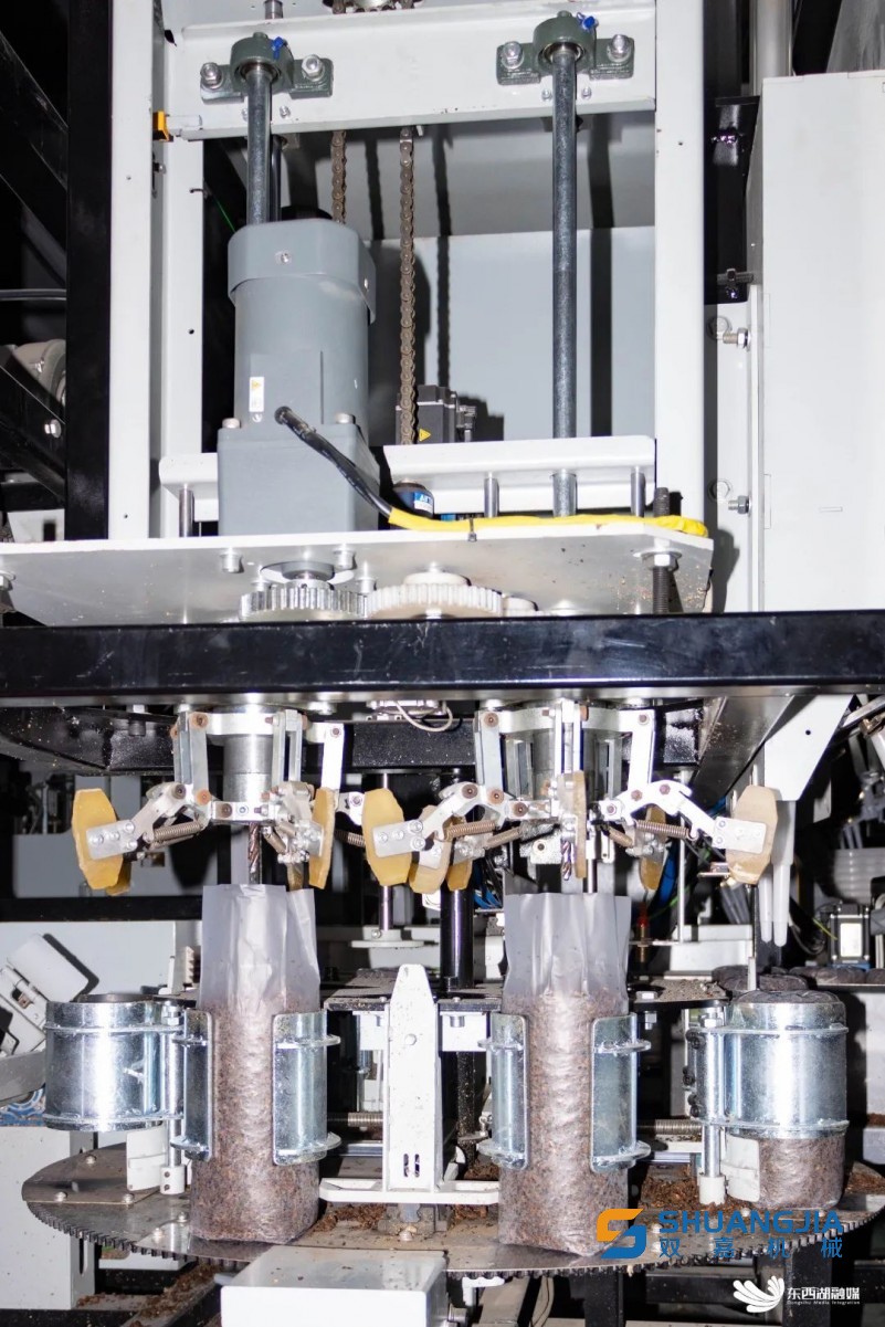 在自動(dòng)裝袋區(qū),生產(chǎn)線代替人工完成套袋、填料、窩口、插棒、裝袋進(jìn)筐等一系列復(fù)雜動(dòng)作。立式螺旋填料方式讓裝料更密實(shí),每包菌棒長(zhǎng)度、重量一致。
