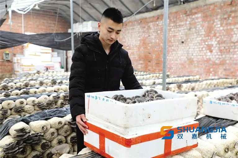 合作社負(fù)責(zé)人王金山介紹,種植基地每畝產(chǎn)量20噸左右,一年可產(chǎn)兩到三茬成品蘑菇,效益十分可觀?!拔覀儗⒂衩装舴鬯椋瑩饺臌熎?、白灰,發(fā)酵后裝入塑料袋,經(jīng)過(guò)高溫消毒后進(jìn)行接種就可以形成菌棒?!蓖踅鹕秸f(shuō),“等菌棒約生長(zhǎng)一個(gè)半月后完全變成白色就能長(zhǎng)出蘑菇,可連續(xù)生產(chǎn)5至6個(gè)月,直至養(yǎng)分耗盡,每畝可放置菌棒約兩萬(wàn)個(gè)。菌棒是蘑菇生長(zhǎng)的培養(yǎng)基,能為蘑菇提供充足的營(yíng)養(yǎng)?!?/p>